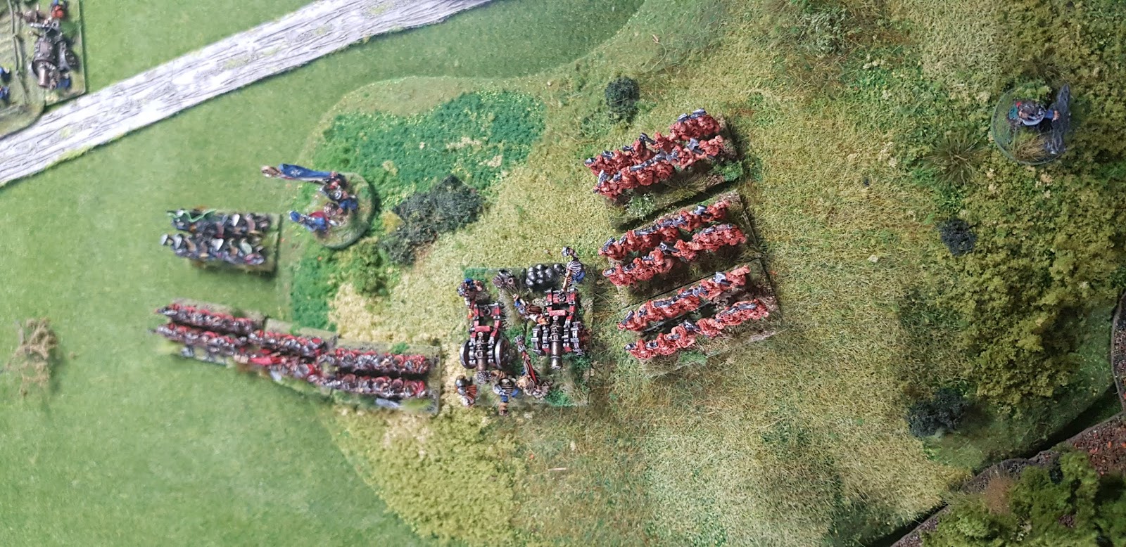 Gorin's dwarfs now need to deploy their entire army. I deploy the artillery in the centre hoping to move it onto the ridge to dominate the battlefield. Frode is tasked with advancing into the farm and using it as an anchor for the dwarf right flank.